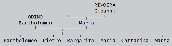 Marta, by 1697 widow of Bartholomeo Odin (who died 5 years before, so in 1692), was daughter of deceased Gioanni Rivoire. She, for herself and for their children Bartholomeo, Pietro, Margarita, Maria, Cattarina, and Marta, claimed the inheritance of her husband, their father.