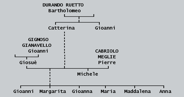 ─ Catterina (vedova del fu Pierre CABRIOLO ossia MEGLIE da Torre e attuale moglie di Giosuè fu Gioanni GIGNOSO ossia GIANAVELLO da Luserna) e Gioanni (sorella e fratello) furono Bartholomeo DURANDO ossia RUETTO da Rorata;